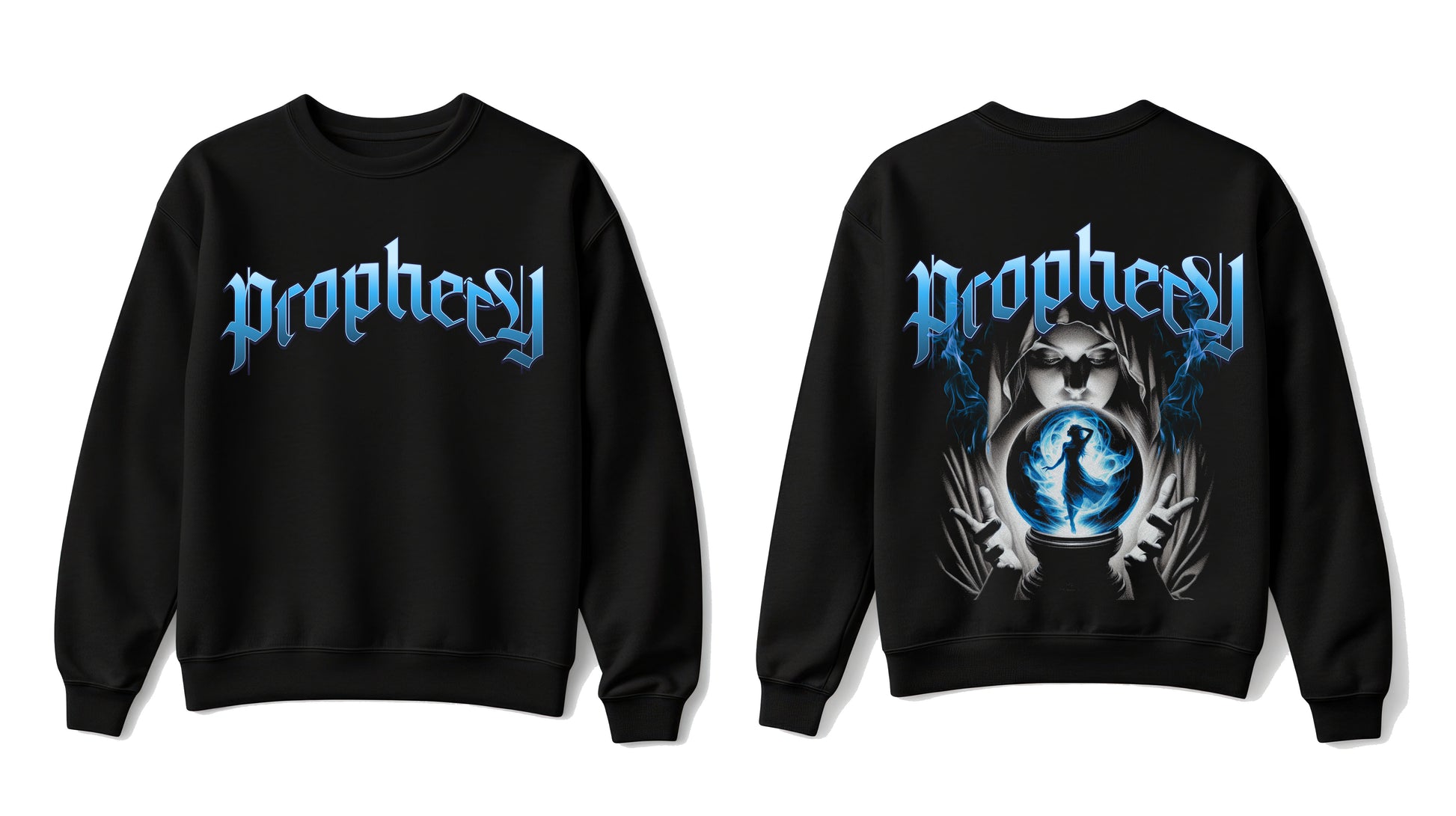 Step into the unknown with the Prophecy Sweatshirt, a bold piece that fuses gothic streetwear with mystical energy. The front features the word “Prophecy” in icy blue, old-English style lettering, while the back reveals a powerful design: a hooded seer summoning visions within a glowing crystal ball. Surrounded by ethereal blue smoke, the artwork creates an aura of mystery and power. Perfect for those who embrace dark aesthetics, spiritual symbolism, and statement fashion, this sweatshirt is more than apparel—it’s a prophecy you wear.
